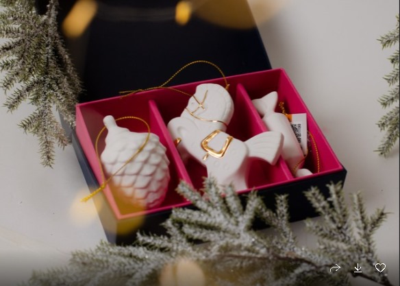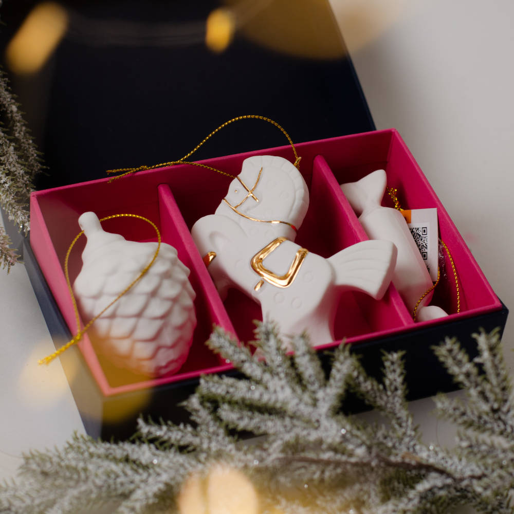 Подвесы в наборе “Шишка, Лошадка, Конфета”, вручную изготовлены из фарфора бисквита и украшены ручной росписью золотом. Текстура фарфора бисквита придает им мягкий матовый оттенок, который прекрасно сочетается с золотом, создавая эффект благородства и изысканности.