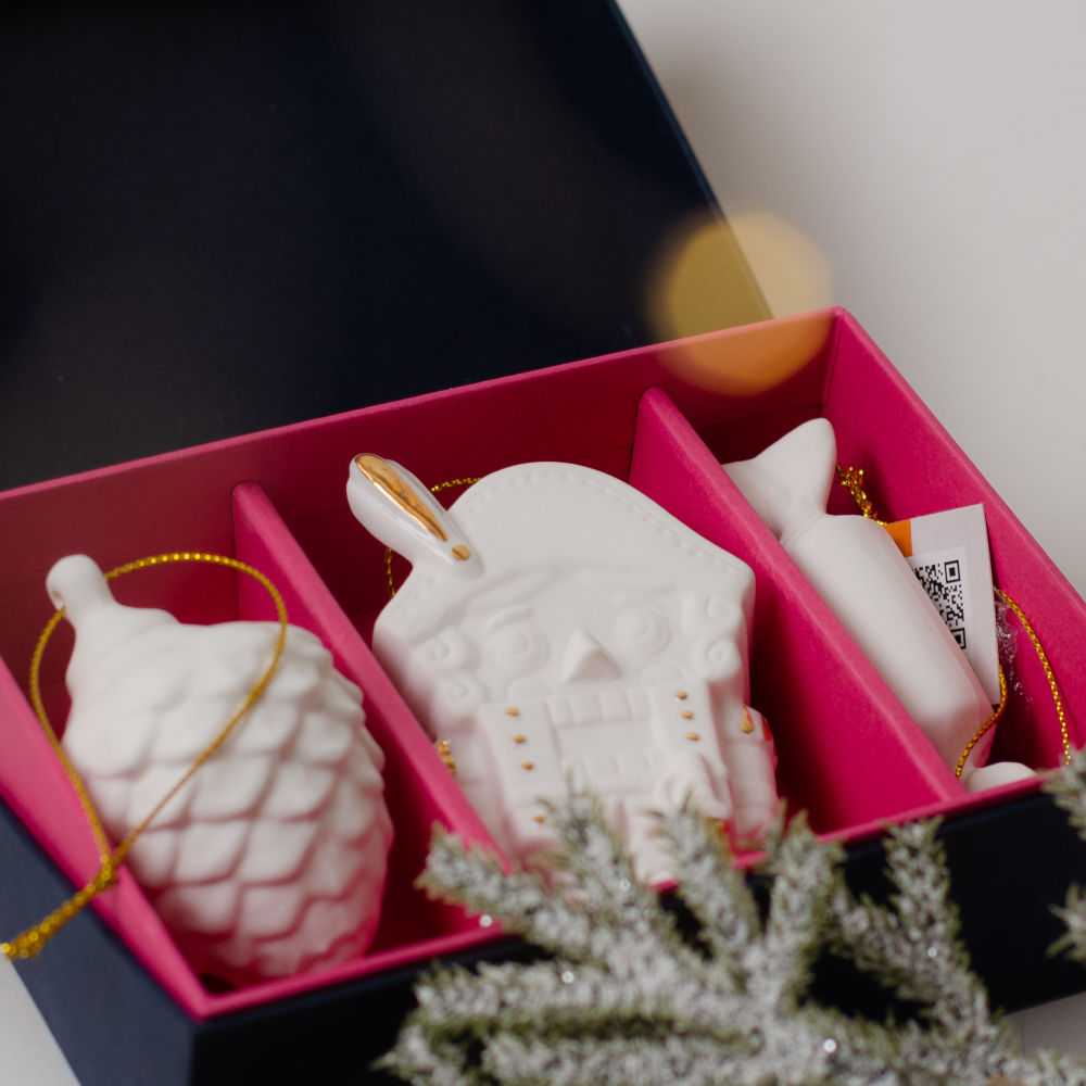 Подвесы, включённые в набор “Шишка, Лошадка, Конфета”, созданы вручную из фарфора бисквита и украшены изящной росписью золотом. Особая текстура бисквита придаёт им нежный матовый тон, который гармонично сочетается с блеском золота, создавая образ благородства и утончённости.