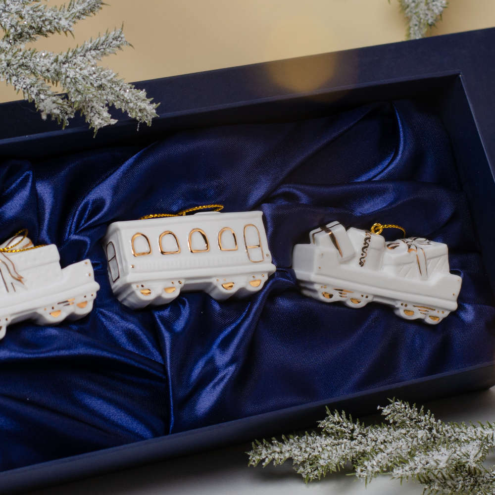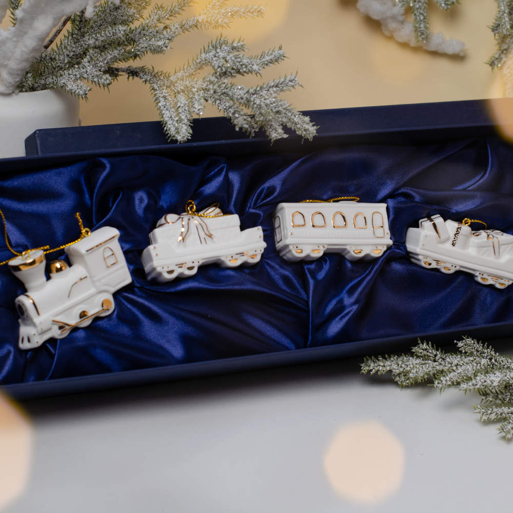Набор подвесов “Паровоз и три вагончика” — это изысканная композиция, воплощающая дух путешествия и волшебства зимних праздников. Все элементы выполнены вручную из фарфора бисквита и украшены росписью золотом. Матовый фарфор мягко рассеивает свет гирлянд, а тонкие золотые линии создают ощущение тепла и роскоши.