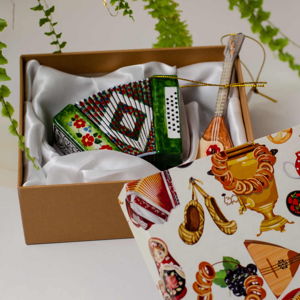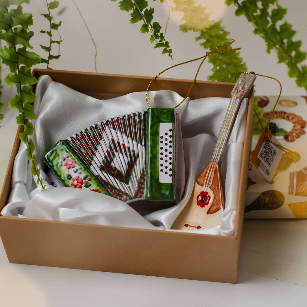 Это изделие представляет набор елочных игрушек ручной работы. В коллекцию Набор “Балалайка и гармонь” представляет инструменты, которые являются душой русского народа. Художник детально асисал яркую чудесную коллекцию, которая привнесёт в интерьер ноты праздничного настроения, привлечет внимание, станет прекрасным подарком на любой праздник.