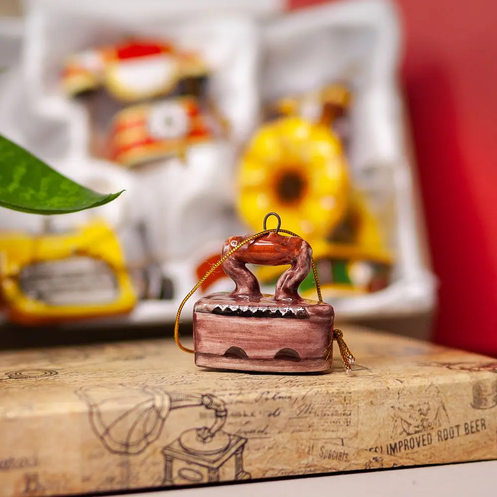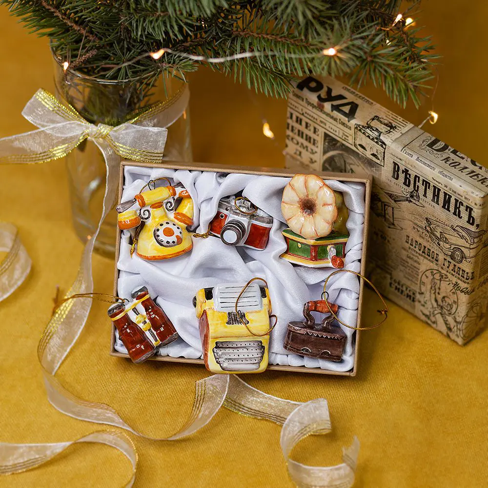 Набор “Ретроштучки” выполнен в технике майолика и украшен ручной художественной росписью. Коллекция “Ретроштучки” включает в себя шесть очаровательных игрушек: телефон, граммофон, утюг, фотоаппарат, пишущая и швейная машинка. Эти винтажные предметы обладают особым шармом и эксклюзивностью, а ручная художественная роспись лишь подчеркивает их оригинальность. “Ретроштучки” несомненно принесут особое праздничное настроение и станут прекрасным подарком не только на Новый год. Украшая ваш интерьер этими игрушками, вы создадите атмосферу уюта и удивите своим умением ценить красоту старинных вещей. Этот набор не только украсит вашу ёлку и дом в праздничные дни, но и станет замечательным предметом коллекции или подарком для тех, кто ценит уникальность и необычность в интерьере.