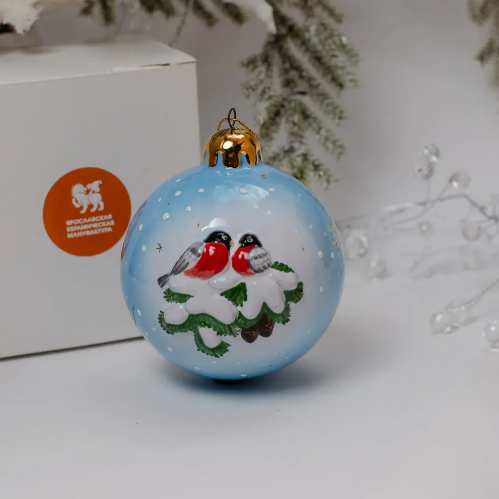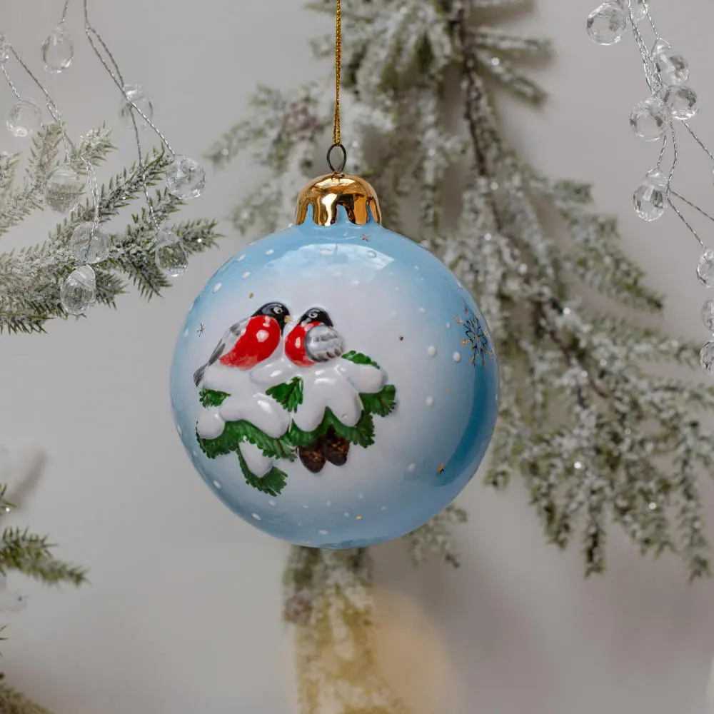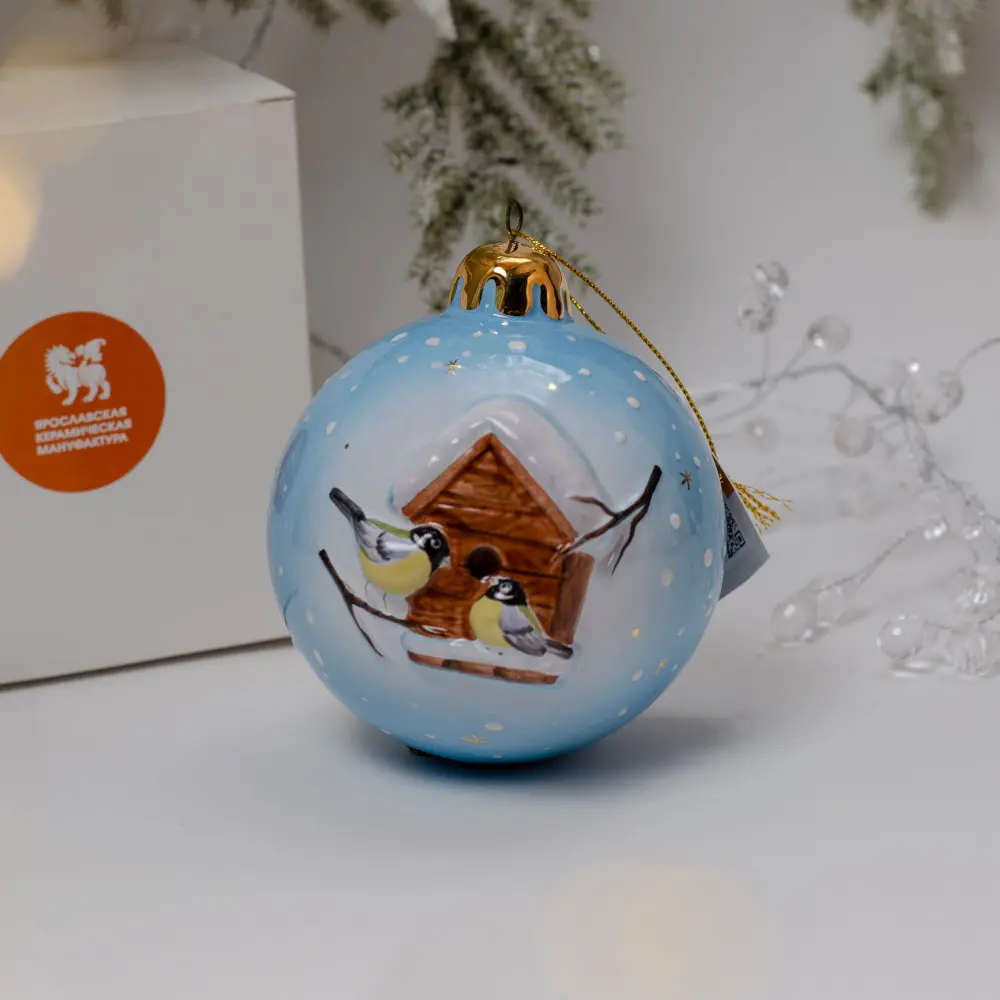 Эксклюзивное изделие ручной работы представляет собой шар с рельефным изображением с одной стороны – бойких синичек около скворечника, а с другой – пары красногрудых снегирей, устроившихся на заснеженной еловой ветке. Обе пары птиц смотрятся ярко и эффектно на фоне голубого зимнего неба с медленно спускающимися снежинками, а позолота добавляет выразительности. Такие шары будут изысканно смотреться, как на самой новогодней ели, так и в гирляндах, украшающих двери, лестницы, и, конечно в праздничных композициях. Они создадут настроение, добавят волшебного очарования и магии любому интерьеру, будут незабываемым подарком к Новому году и Рождеству, который будет оценен по достоинству и подчеркнёт вкус дарителя.