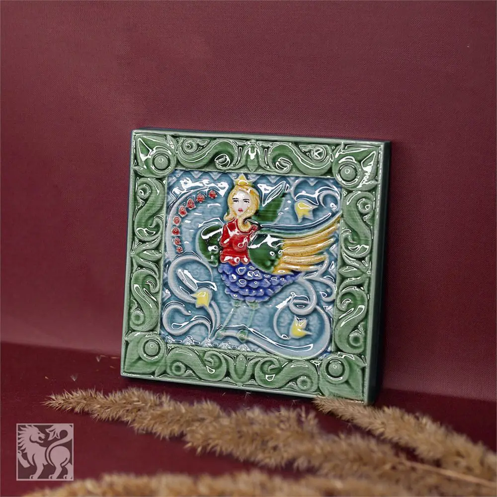 Изделие представляет керамический рельефный элемент квадратной формы, покрытый глазурью. На зеленом фоне яркими цветными красками нанесено стилизованное изображение райской птицы с головой девы. Птица Сирин обладает прекрасным чарующим голосом. Она покровительствует слабому полу. Сирин символизирует свободу полёта, чистоту и высокую нравственность, её изображения становятся сильнодействующими оберегами и талисманами. Данное изделие может быть использовано как изразец, и как самостоятельный настенный декор. При этом смотрится стильно и эффектно, может использоваться в местах, где фантазия архитектора или дизайнера по интерьеру не ограничивается типовым решением, он позволяет сделать акцент, привлекающий взгляд, внести завораживающую изюминку в интерьер. Изразец также будет прекрасным подарком родным, близким, коллегам по работе.